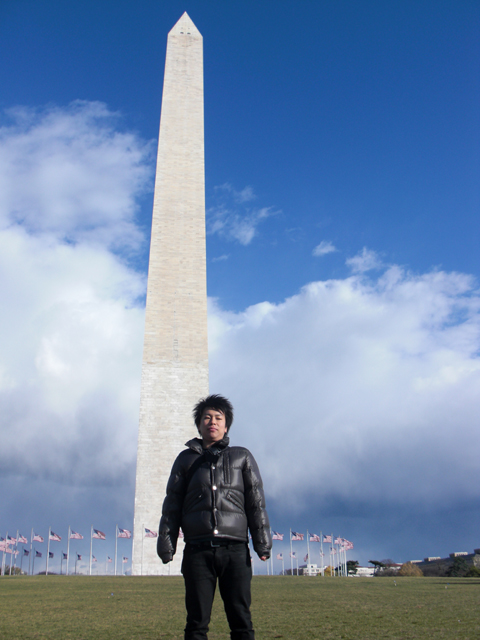 聳え立つ塔と松元君。ワシントンは寒かったようです