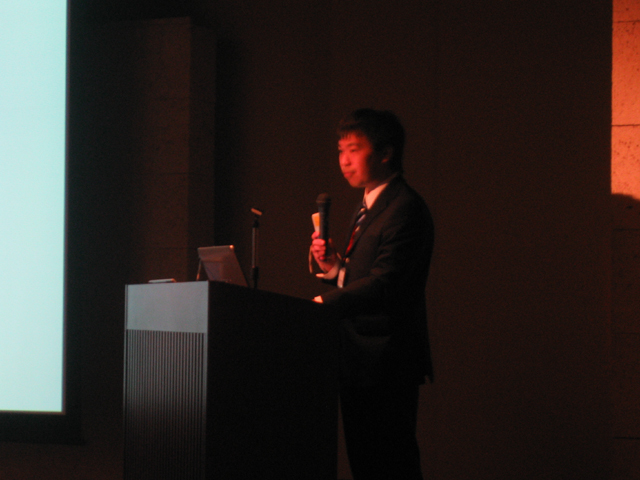 福市さんの発表。とても広い会場での発表でした。