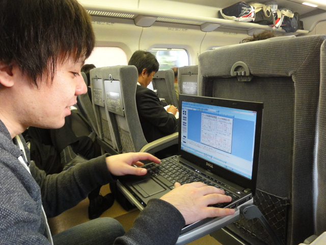 新幹線の中 発表に向けて最終確認をする諸見里君