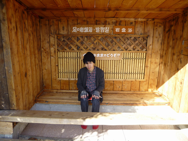 足の岩盤浴をする黒田さん。あったかそう〜?