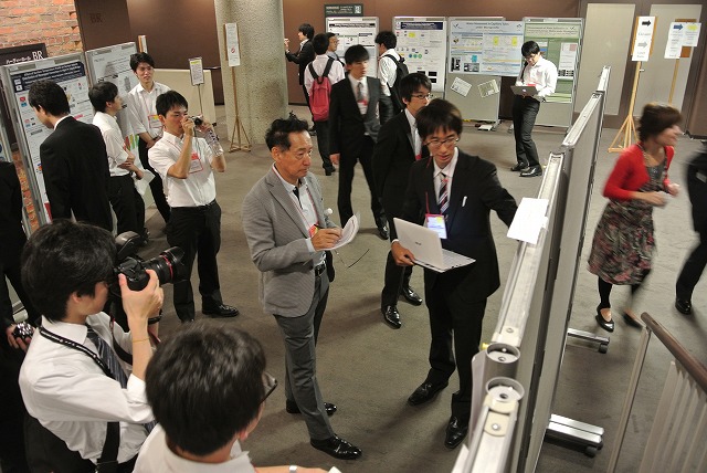 宇宙飛行士の毛利衛さんにポスター発表している丹羽くんです.
