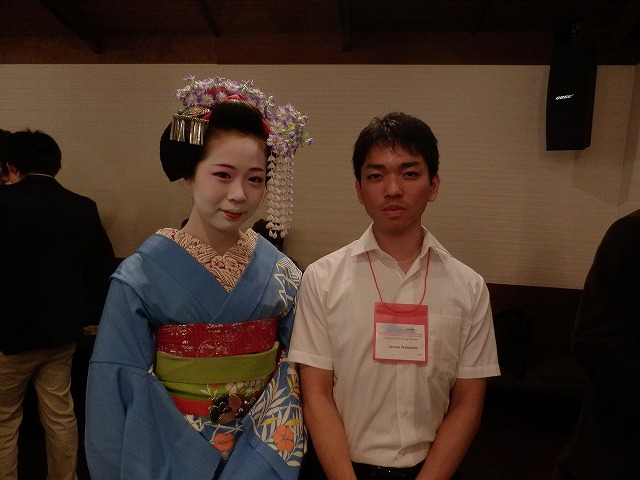 舞妓さんと一緒に写真を撮ってもらったB4の渡辺くん.
