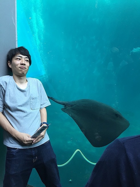 大きなエイと石崎さんのツーショットです。