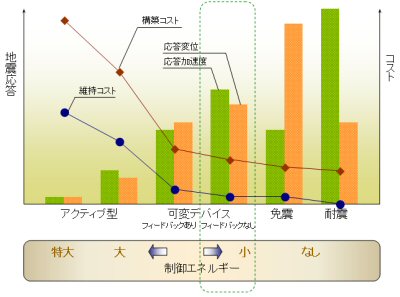 制御エネルギーとコストの小さい可変デバイス制振 地震動の時刻歴がすでに分かっているとしたら、建物を動かすことができるだけのデバイスを用いれば応答はなくなるが、消費エネルギーやコストを考慮すると現実的でない。可変デバイスを用いたパッシブ(セミアクティブ)型制振が実現性が高い。 |