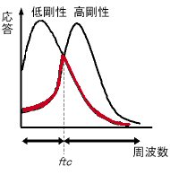 剛性の切替による避共振化 免震戸建住宅では、台風時の風対策としてロック機構が設けられる。すでに2種類の剛性が利用できるので、地震動の周波数特性により剛性を切り替えて、避共振化を目指す。 |