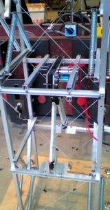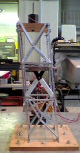 剛性切替型建物の地震応答実験 解析結果を検証するため、剛性をコントロールできる1質点型簡易モデルを製作し、地震応答実験を行う。 |