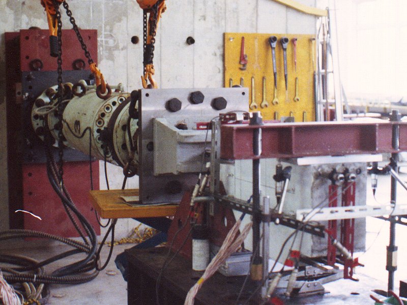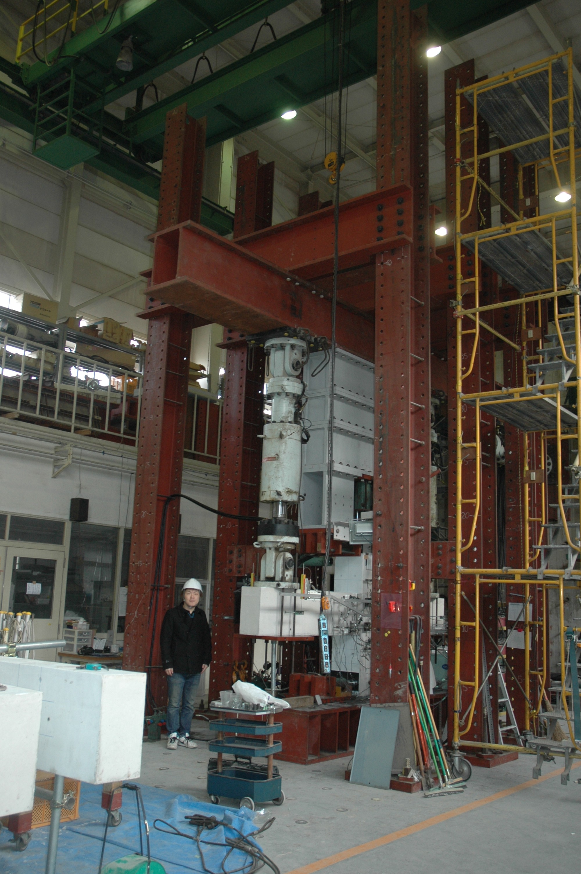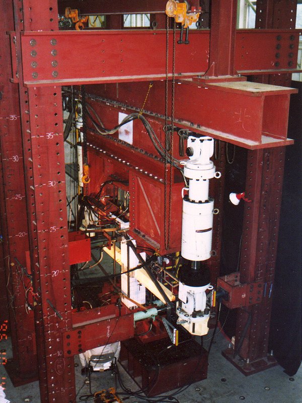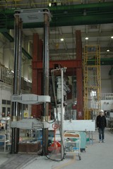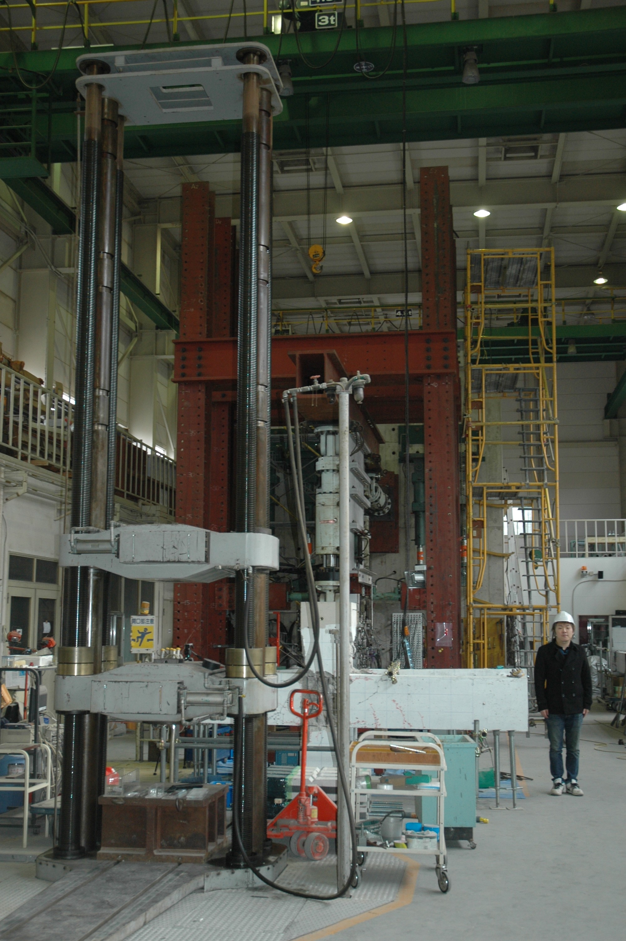 反力床、反力壁にフレームやアクチュエーターを取り付け、梁、柱等の大型試験体に加力を行います。 1000kN(100tonf)アクチュエーターが3台、1000kN(100tonf)オイルジャッキが6台あります。