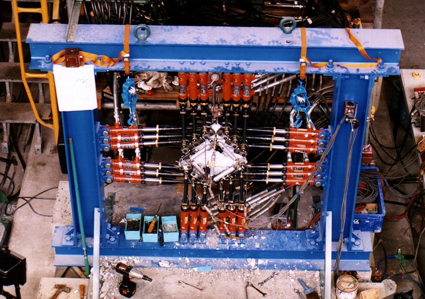 300mm四方のコンクリート板に24本のオイルジャッキにより、任意の2軸加力を行うことができます。